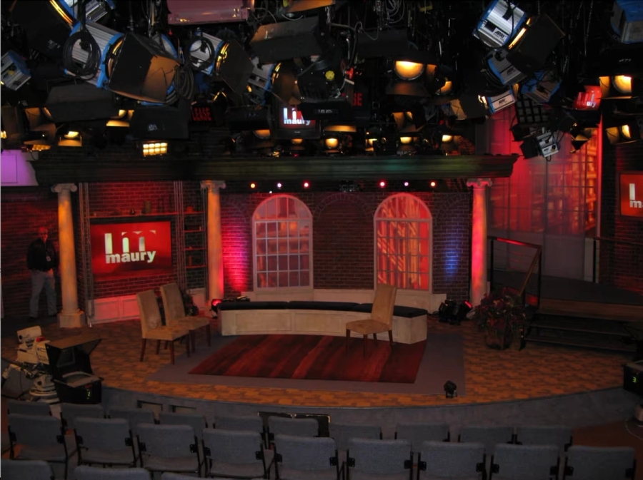 That Maury, Jerry Springer, and Steve Wilkos would eventually be taped in the exact same Stamford studio hall—thanks to the lure of a hefty Connecticut tax credit incentive—is not surprising. Nor is the fact that their three-in-one studio build was rushed, taking only 10 weeks. Or that between show tapings, an overhead crane would switch out backdrop centerpieces, and a new stage would materialize over the course of three hours. Set designers and lighting experts would transition, say, Springer’s grimy underworld—all exposed pipes and whirring industrial fans, its flooring now concrete, not carpet—into the joyless prison yard that is The Steve Wilkos Show, which is hosted by an ex-Chicago cop and longtime Springer security guard, and where troubled guests enter via a hulking cartoon-evil door, a swinging stack of cinder blocks. Next taping: Maury’s stagelit salon, with its shelves of fake orchids and candlestick holders and flowerless vases, and its classical Cheesecake Factory columns, which look almost romantic when drenched in gelled blue lights.