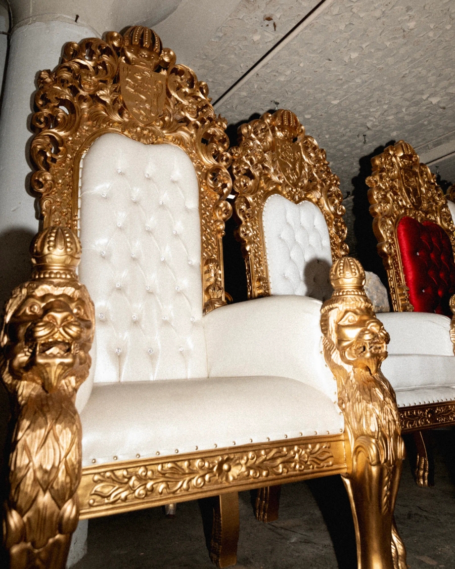 It just so happens that both of those groups—Santas-for-hire and actual sovereign rulers—are returning customers at Throne Kingdom, the global throne retailer whose headquarters I’m visiting. Open to the public six days a week, Throne Kingdom HQ is located within Brooklyn Army Terminal, a beige business park that also hosts a waffle cone manufacturing plant, a chocolatier, and a medical devices company. I’m greeted at the entrance by Allen’s son, Sol—an eager throne dealer and heir to his father’s mass-market empire—and together we walk through aisles of towering seats, while Allen ricochets from call to call, doling out delivery rates.