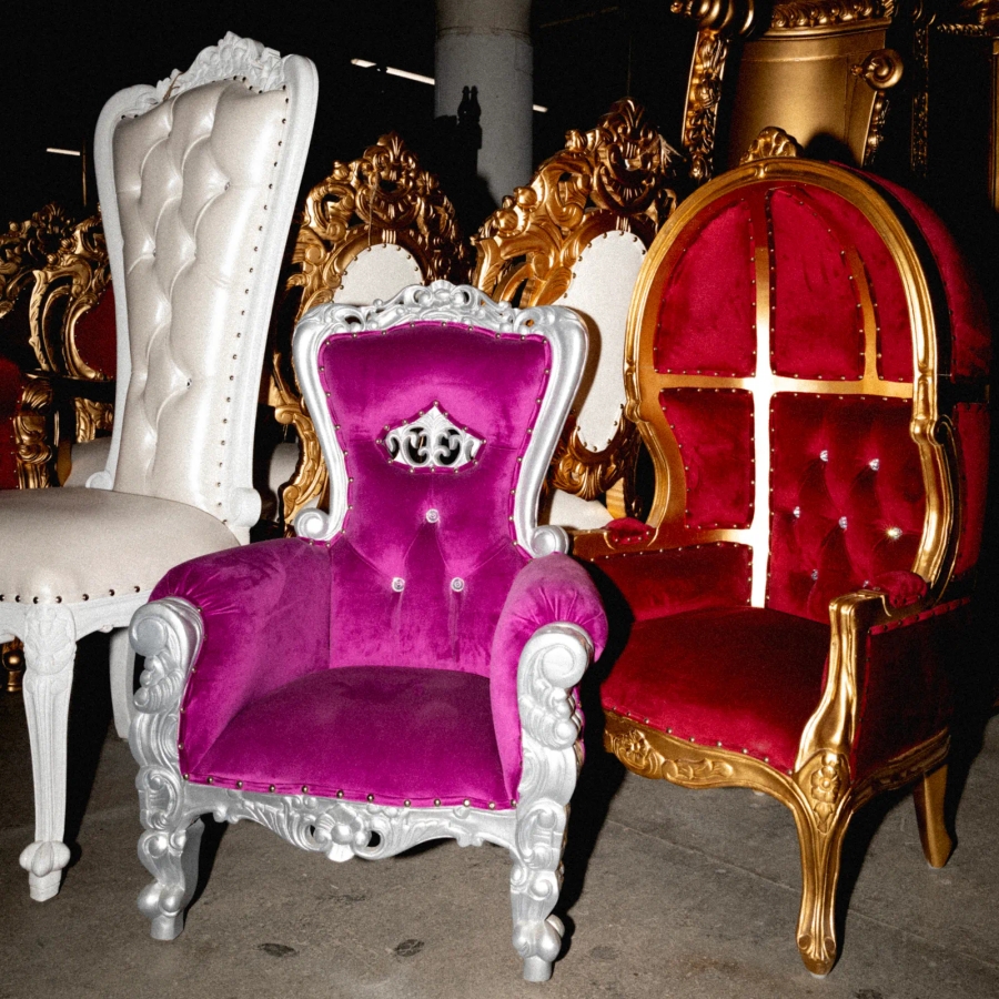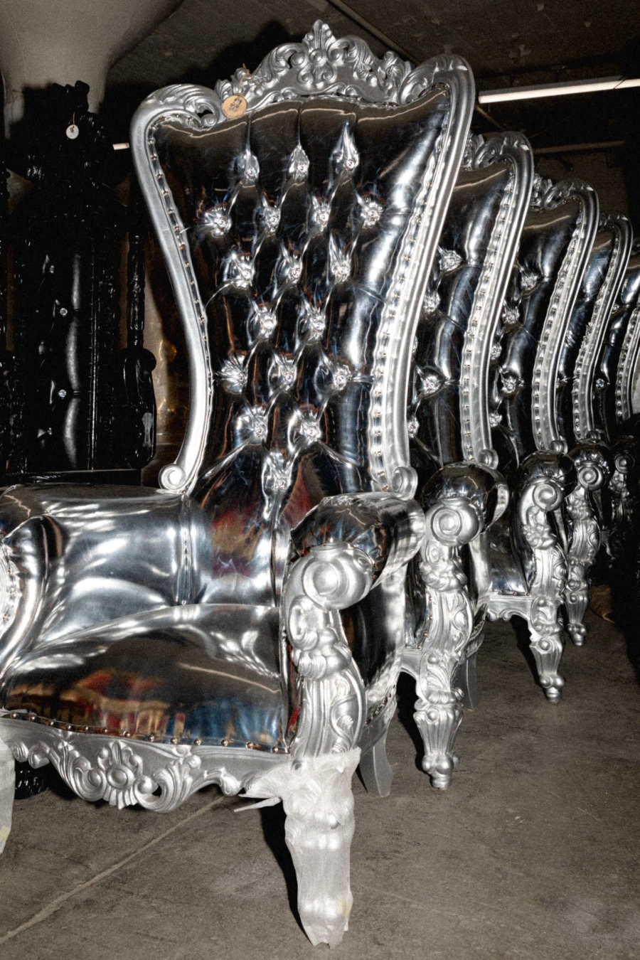 The majority of Throne Kingdom’s product has a similar visual vernacular, though almost anything is possible design-wise through their customization offerings. There’s usually a high, enclosing back and armrests; tufted cushioning in velvet or vinyl or faux patent leather; a solid-wood frame with decorous hand-carvings, painted gold or silver or white. Each chair is produced especially for the retailer by a handful of Indonesian manufacturers—carvers, upholsterers—including one they’ve known for 15 years. (Throne Kingdom chairs use toona sureni or suren toon, an Indonesian-grown wood native to the mahogany family.) Products are shipped straight from Brooklyn Army Terminal, where any final customizations occur, too, such as embroidery, logos, or special fabrications. Right now, they’re experimenting with embedding faux gemstones in frames for a commercial client. Sol lays the samples out before me, and we both turn them over in our palms: costume rubies of glittering cubic zirconia, as well as a budget-friendly option in glass.