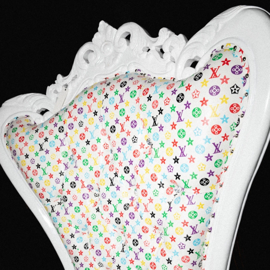 Throughout the stream, the throne expands Nicki’s physical and psychic presence. No matter that she arrives at 3 a.m.—four hours behind schedule—the bubblegum colossus is her stand-in. An ancient beacon of divinity, it assures sleepy fans her tardiness is justified: After all, Nicki is a star, the queen of rap, and queens have things to do. The high backrest augments her physicality, so that even seated in the middle distance, her torso commands the full height of the frame. The object thrums, to paraphrase the critic Dave Hickey on Liberace, with an ersatz spiritual dazzle. Nicki holds court on it, then co-opts its plush, bedazzled body for comedic effect, and as an act of ownership: twerking on its phony royal arms, draping her body cutely over the cushioning, leaning into it with mock self-importance. Before she leaves, she autographs the throne’s upper corner—permanently remaking it in her image—and tells Kai his future guests can sit in it for good luck.