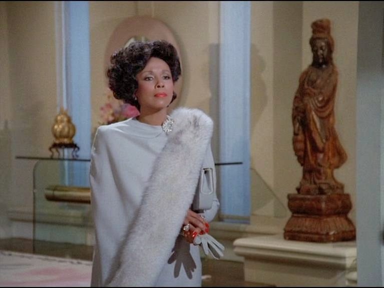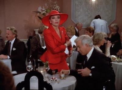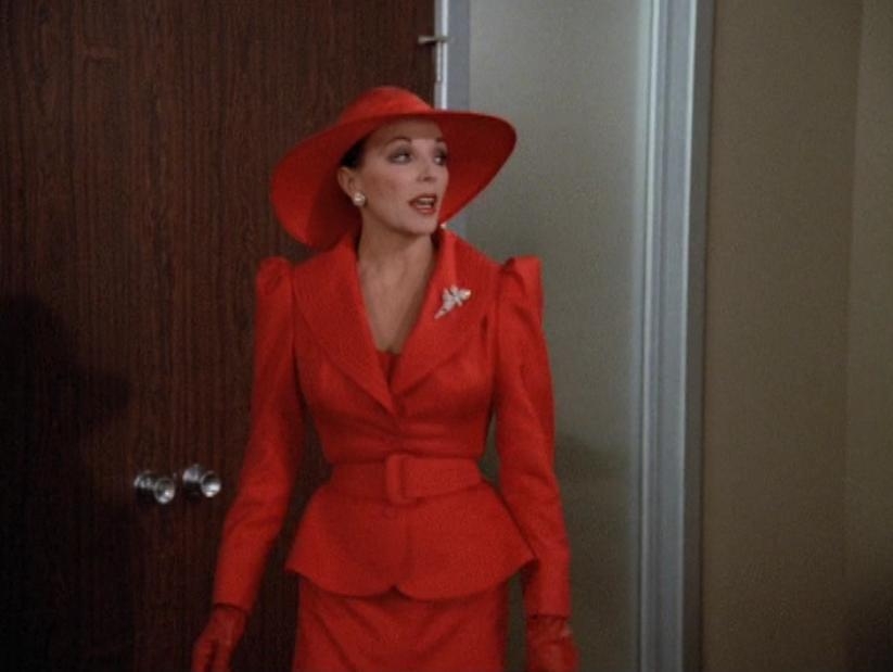 I’ve been watching Dynasty a lot again, and keep thinking about Alexis’ angular, high collared skirt suits by costumer Nolan Miller, who was given a $30,000 budget per episode by producer Aaron Spelling. Miller also did the grey-lavender dress and cape-with-stole Dominique Deveraux wears in her very first scene, which moves so fluidly.