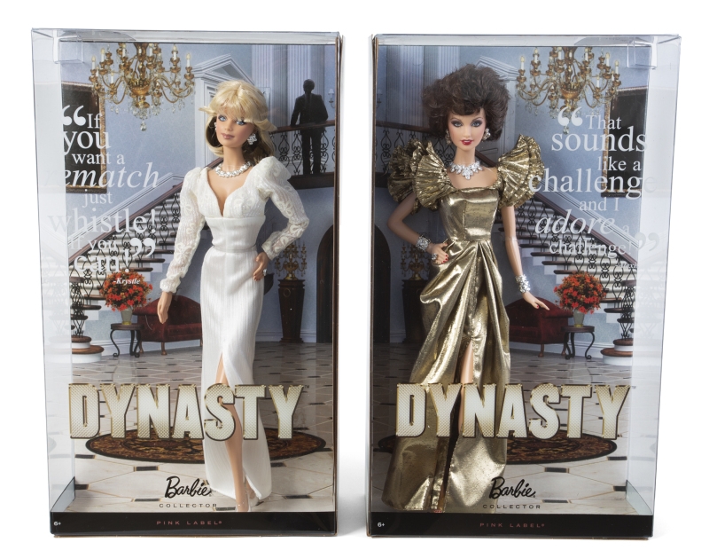 First Barbie: an admittedly unconvincing Alexis Carrington Colby of Dynasty, clad in ruffled gold lame (based on an iconic Nolan Miller gown) and tiny faux diamonds. The effigy was produced in 2010 for Newly Nostalgic, an 80s throwback collection. According to Barbiepedia, the plastic 11.5 inch-tall doll “cannot stand alone,” which is character assassination. I want her, in spite of it. (A strangely charming backup are these World Doll Dynasty collectibles. The Krystal has seen a lot.)